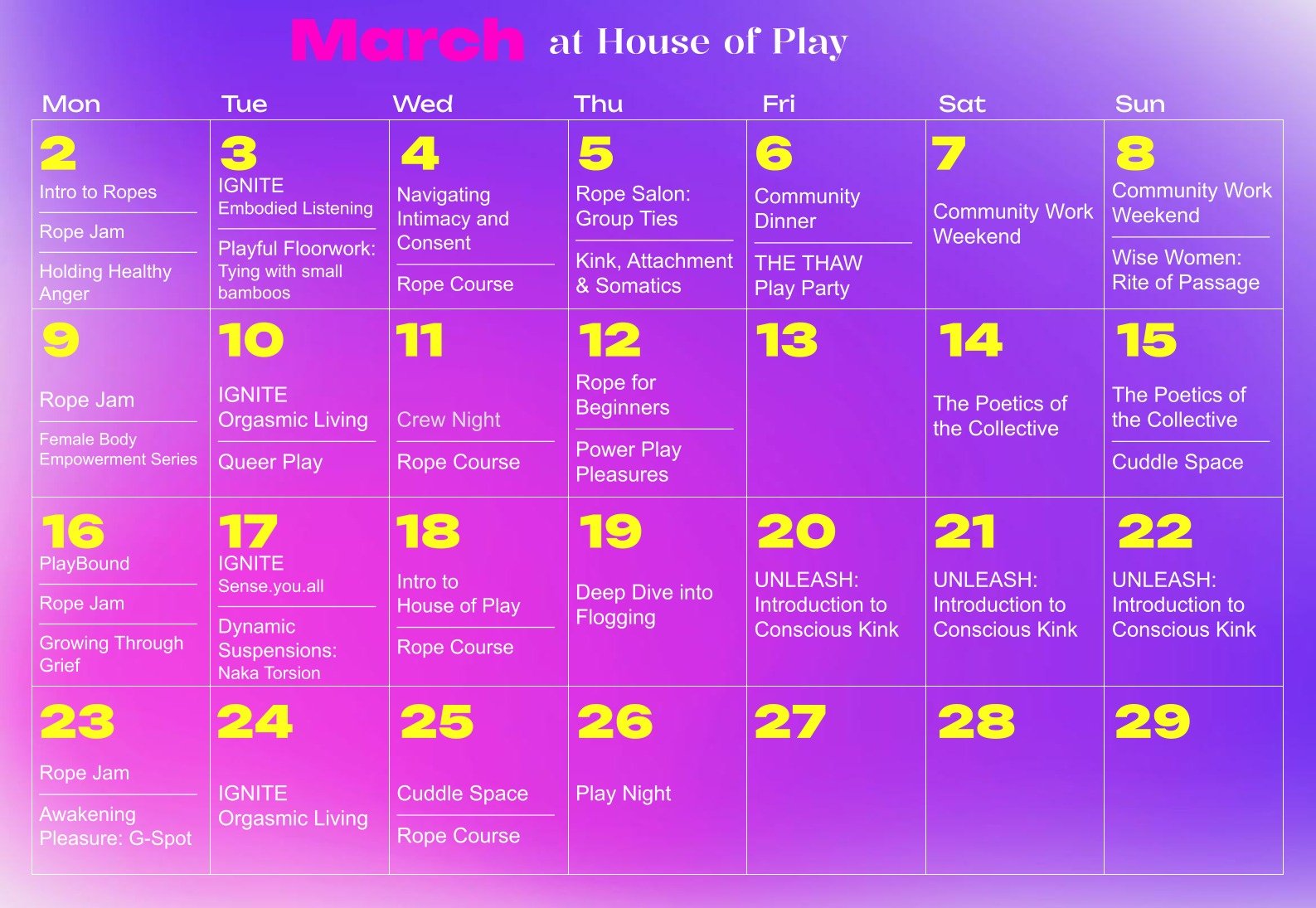 Unleash your creativity with ropes–whether you're a beginner or experienced, it’s a space to tie, connect, and explore with others.
